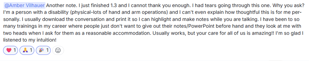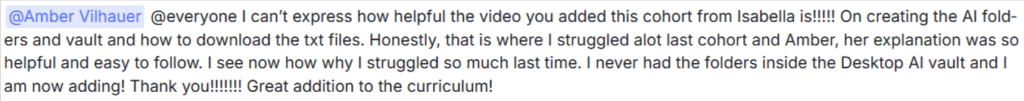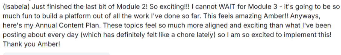 The grounding and clarity I've gained, along with the AI and structure/systems, have been game changing. What I like best is the actions you take and the modeling. I've treated my clients with a great deal of care and guidance over the years, so I appreciate how you show up! I also appreciate the organization. I'm a big observer and watch and listen more than most, and the overall experience is a 10+. Thank you Amber and company!