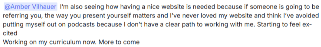 I wanted support in a program that would help me bring my message and clarity of thought together in order to start to put the tendrils of my new work into the world feeling a strong inner anchor. My challenges were that I've never launched before, I wanted support and a clear map to work off of, and I wanted a community of people to learn alongside with because it's always better to do big things with people who are equally committed to leaping, growing, and supporting each other along the way.