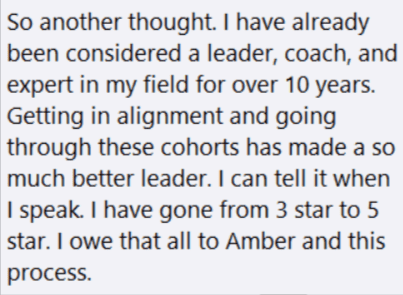 Coming into Alignment has been the most valuable shift for me, and it’s continually evolving. Before joining, I faced a lack of clear steps that were needed to move forward. This program provided the needed structure and questions to bring out the wisdom that is moving through me in a way that I believe will be well-received. Some of the answers are not clear yet, but just asking the questions is helpful in that process. I now have an understanding of the different systems and team members needed, as well as the strategy to employ. While there's no additional revenue yet, that would change by offering a cohort in the near future. I'm deeply grateful to connect with Amber, to meet everyone in this group, and those that Amber introduced me to individually. A HUGE heartfelt thank you to Amber for who you are in this world! You are truly inspiring.