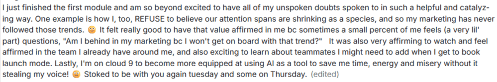 Before joining, I had too much to do and too little time. The fear of getting to launch after all the hard work and investment and failing on launch day was real. My main concern with investing in myself is that I've been "investing" and planting seeds for two and a half years without monetizing, and seeing an end to my runway is the main concern on top of the fear of not being able to provide. I've seen an improvement in confidence, more clarity on the opportunities to monetize, a more structured system and support from other experts, and the expanded network. Feeling part of a great community is also an important boost to confidence. I'm extremely grateful for the support and for being a part of such a remarkable community. It's really life changing!