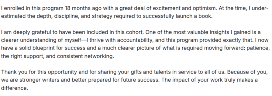 This program is designed to eliminate that waste. You’re not buying “information.” You’re investing in a proven system that delivers real assets (brand guide, website copy, book curriculum, content plan) aligned to your authentic voice. You’ll leave with work done, not just another digital shelf of unfinished lessons.