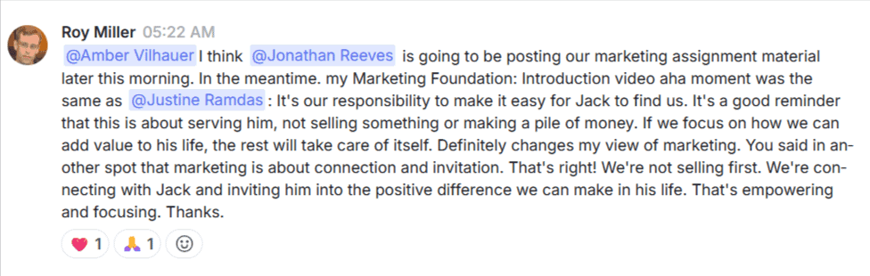 The most valuable insight was an entirely new approach to working with AI in a way that weaves our mission, Vision, Why, and Avatar into every single prompt, every single time, piecing together an elegant, strategic assist. The way I use AI will never be the same. I created valuable resources for myself and my business in an hour, which might have taken weeks previously.